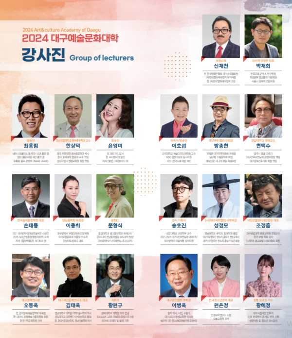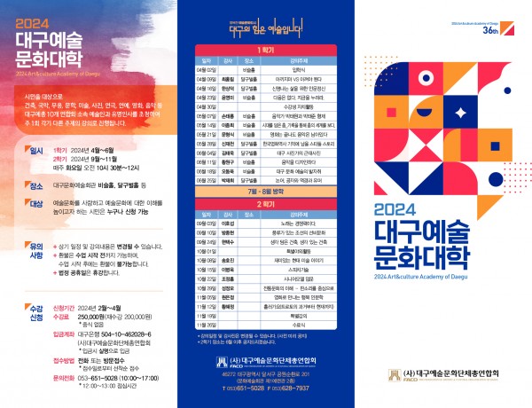 2024 대구예술문화대학 수강생 모집 페이지 정보 작성자 관리자 작성일24-03-15 11:55 댓글0건 관련링크 이전글 다음글 목록 본문 □ 접수방법 : 전화 접수 : 성함, 연락처 > 수강료 입금 >접수 완료 (입학식당일 입학원서 작성) 댓글목록 등록된 댓글이 없습니다. 이전글 다음글 목록